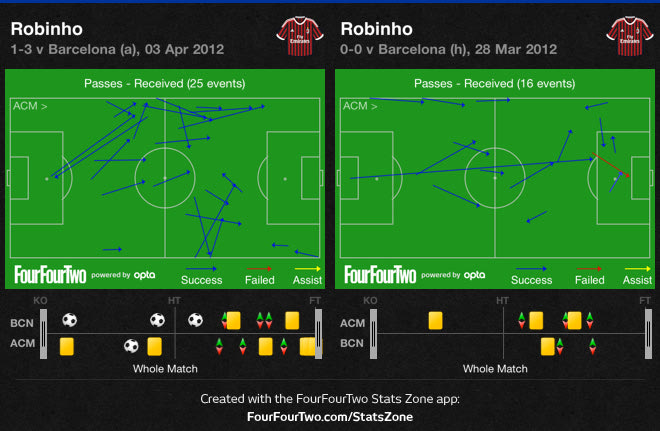 Επίσης είχε ενδιαφέρον κι η θέση του Ρομπίνιο. Στον πρώτο αγώνα δεν τα πήγε καλά, επειδή δεν έκανε αρκετά για να ανοίξει την άμυνα της Μπαρτσελόνα με την κίνηση του με ή χωρίς τη μπάλα. Τώρα ήταν πολύ καλύτερος. “Βάθαινε” χωρίς τη μπάλα και δημιουργούσε έναν σχηματισμό 4-3-2-1 κι αυτό ανέβαζε τον Μαστσεράνο σε περιοχές που δεν πήγαινε καλά. Το γκολ της Μίλαν ήρθε όταν ο Αργεντινός είχε παρασυρθεί μακριά κυνηγώντας τον Ρομπίνιο, αφήνοντας τον Νοτσερίνο ελεύθερο να δράσει. Ο Ρομπίνιο δεν έκανε κάτι τέτοιο στο πρώτο παιχνίδι, όταν έμενε αρκετά ψηλά. Αυτή ήταν μια μεγάλη βελτίωση.
