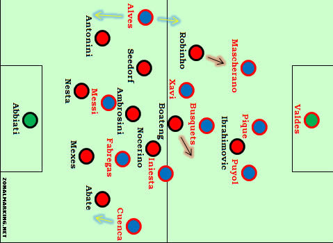 Το σχήμα βοήθησε τη Μπαρτσελόνα να πιέσει ψηλά, με τέσσερις παίκτες απέναντι σε τέσσερις και φάνηκε ξεκάθαρα το πρόβλημα της Μίλαν να ξεκινήσει τις επιθέσεις της από πίσω. Το λάθος του Φιλίπ Μεξές που οδήγησε στο πρώτο γκολ είναι ένα κλασσικό παράδειγμα. Χωρίς αμφιβολία πίεσαν λιγότερο αποτελεσματικά στο κέντρο, κυρίως επειδή είχαν μπερδευτεί οι αρμοδιότητες του Τσάβι και του Ινιέστα.