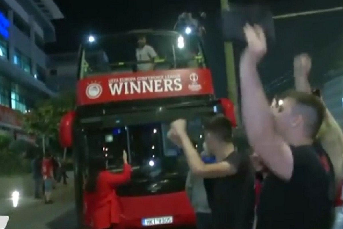 Την ίδια ώρα, ένα ανοιχτό διώροφο λεωφορείο σαν αυτά που χρησιμοποιούνται σε παρόμοιες περιπτώσεις (parades) θα παραλάβει την αποστολή των ερυθρόλευκων στη Λεωφόρο Συγγρού, για να κατέβει αργά-αργά προς το σημείο στο οποίο έχουν συγκεντρωθεί δεκάδες χιλιάδες οπαδοί που περιμένουν να αποθεώσουν τους θριαμβευτές.