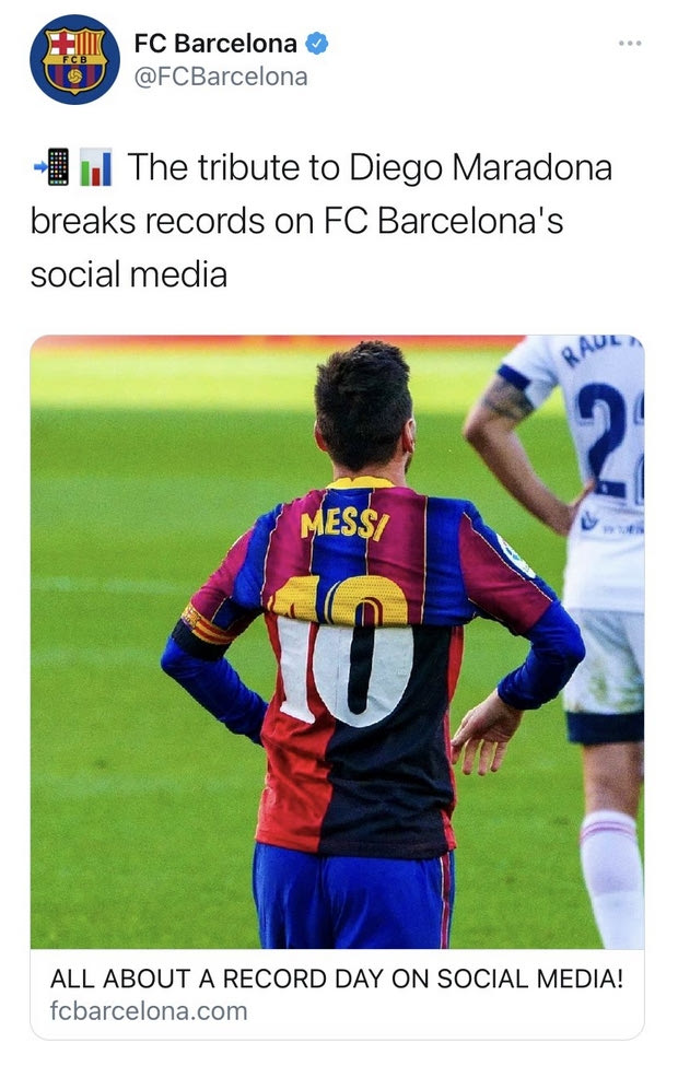 Η Μπαρτσελόνα προχώρησε σε μία απαράδεκτη ανάρτηση στο twitter, στην οποία πανηγύρισε την κατάρριψη των ρεκόρ σε αλληλεπιδράσεις στα social media από τις τιμές προς τον Ντιέγκο Μαραντόνα.