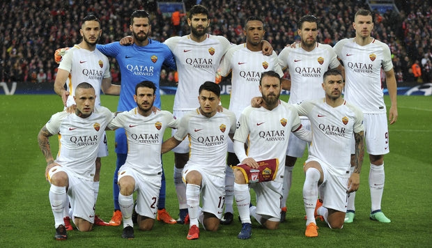 Roma players pose for a photo prior the Champions League semifinal, first leg, soccer match between Liverpool and Roma at Anfield Stadium, Liverpool, England, Tuesday, April 24, 2018. (AP Photo/Rui Vieira)