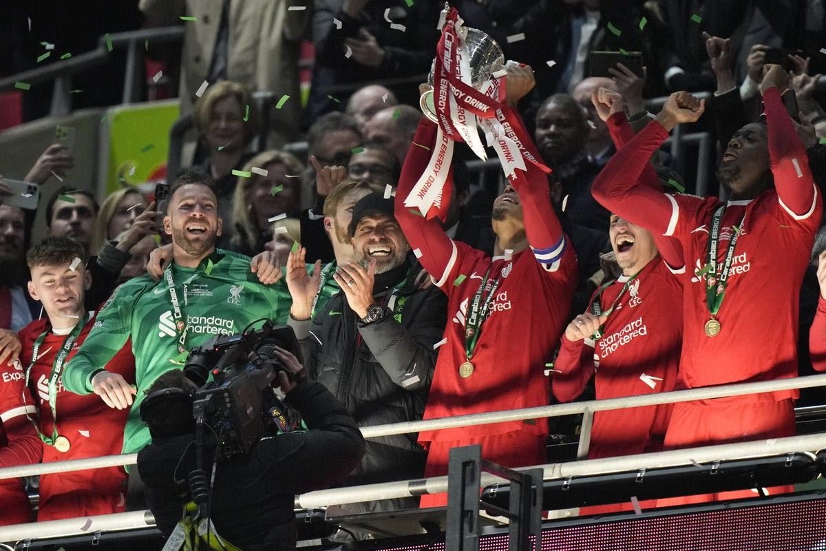 Liverpool's manager Jurgen Klopp celebrates with his players after they won the English League Cup final soccer match between Chelsea and Liverpool at Wembley Stadium in London, Sunday, Feb. 25, 2024. (AP Photo/Alastair Grant)