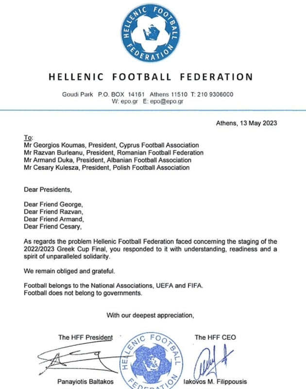 Η επιστολή κοινοποιήθηκε και σε FIFA – UEFA καθώς και στις υπόλοιπες ομοσπονδίες μέλη της UEFA. Αναλυτικά η ευχαριστήρια επιστολή της Ελληνικής Ποδοσφαιρικής Ομοσπονδίας:
