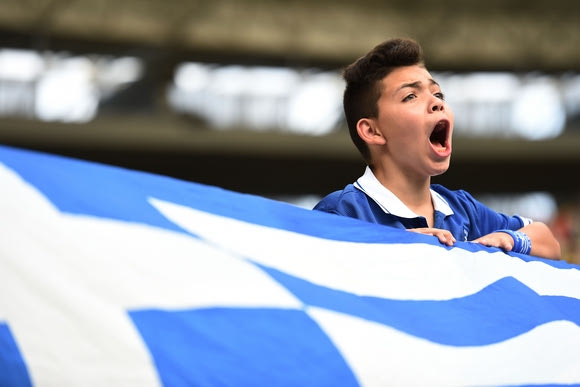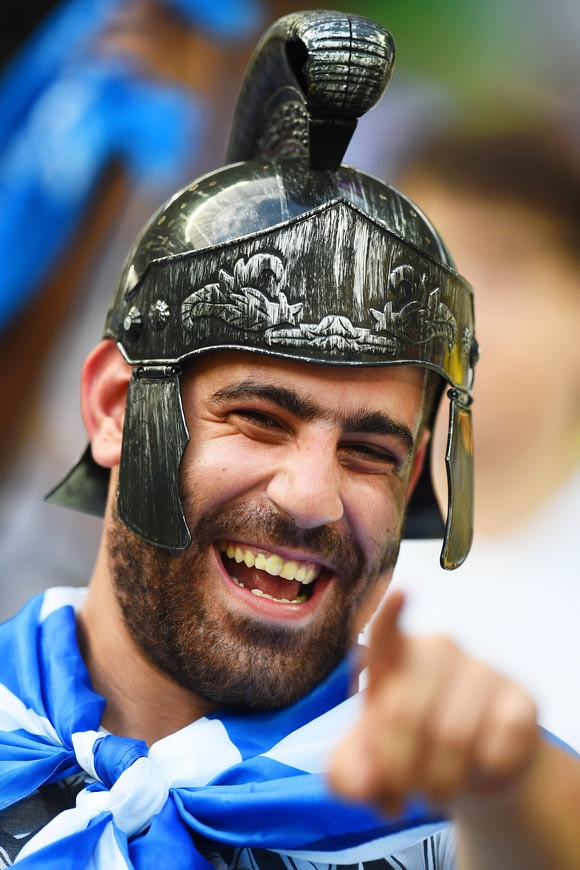FORTALEZA, BRAZIL - JUNE 24: A Greece fan enjoys the atmosphere prior to kickoff during the 2014 FIFA World Cup Brazil Group C match between Greece and the Ivory Coast at Castelao on June 24, 2014 in Fortaleza, Brazil. (Photo by Jamie McDonald/Getty Images)