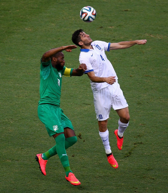 FORTALEZA, BRAZIL - JUNE 24: Didier Drogba of the Ivory Coast and Konstantinos Manolas of Greece go up for a header during the 2014 FIFA World Cup Brazil Group C match between Greece and the Ivory Coast at Castelao on June 24, 2014 in Fortaleza, Brazil. (Photo by Robert Cianflone/Getty Images)