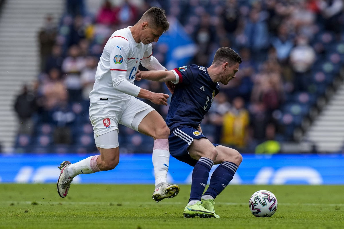 Czech Republic's Lukas Masopust, left, duels for the ball with Scotland's Andrew Robertson during the Euro 2020 soccer championship group D match between Scotland and Czech Republic, at Hampden Park stadium in Glasgow, Scotland, Monday, June 14, 2021. (AP Photo/Petr David Josek, Pool)
