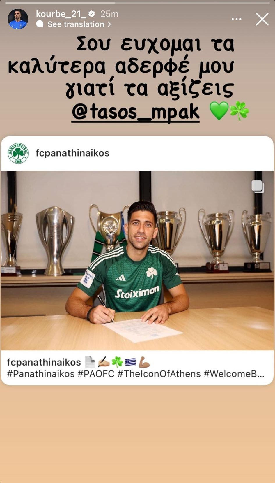 Με story στο Instagram ο Φώτης Ιωαννίδης καλωσόρισε τον Τάσο Μπακασέτα, που υπέγραψε στον Παναθηναϊκό για 3,5 χρόνια.