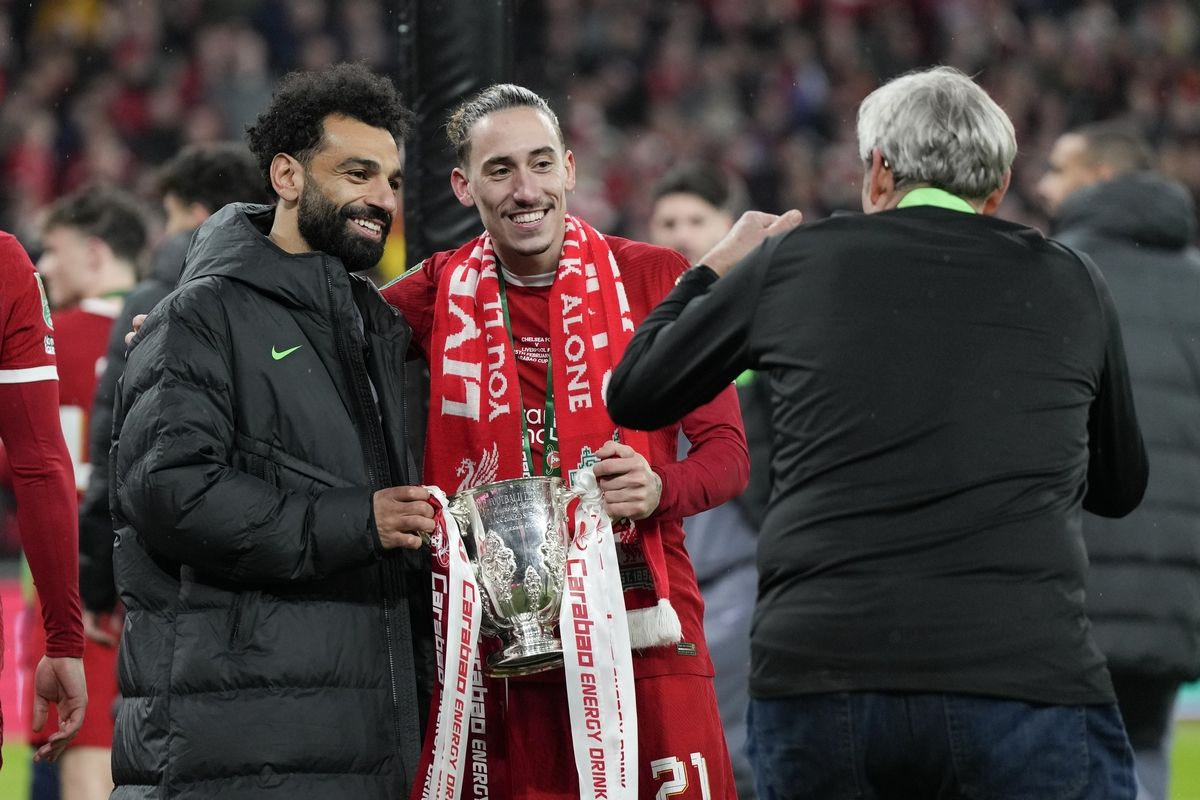 Liverpool's Mohamed Salah and Liverpool's Kostas Tsimikas pose with the trophy after winning the English League Cup final soccer match between Chelsea and Liverpool at Wembley Stadium in London, Sunday, Feb. 25, 2024. (AP Photo/Alastair Grant)