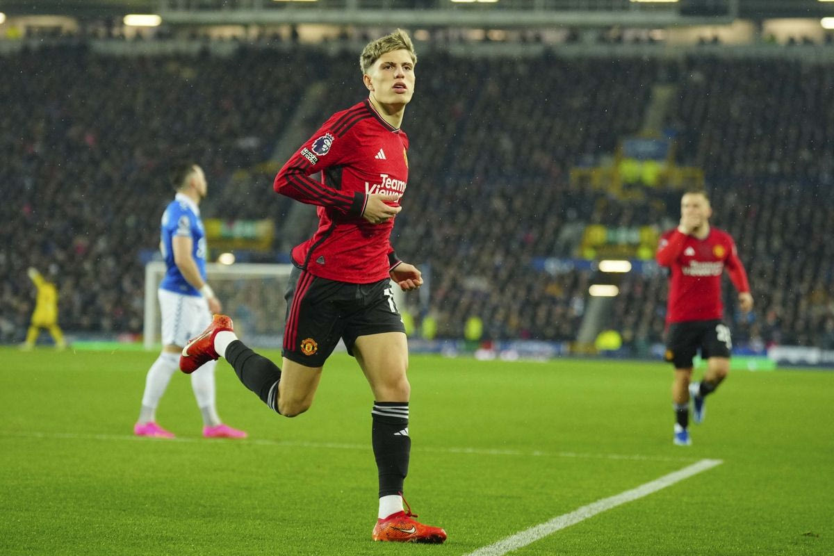 Manchester United's Alejandro Garnacho celebrates after scoring his side's first goal during the English Premier League soccer match between Everton and Manchester United, at Goodison Park Stadium, in Liverpool, England, Sunday , Nov. 26, 2023. (AP Photo/Jon Super) © 2023 Jon Super/ AP IMAGES
