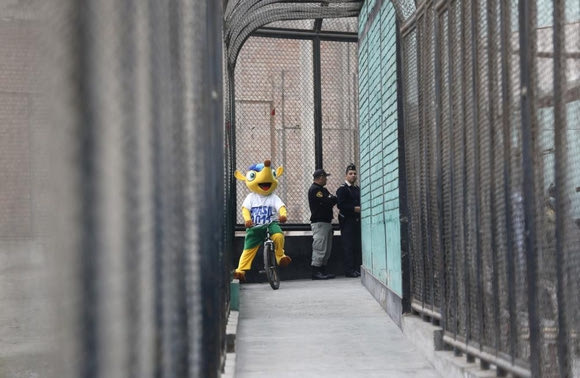 The World Cup mascot "Fuleco" performs next to inmates during the opening ceremony of the football championship for prisoners at the Castro Castro Prison, in Lima Peru, Monday, June 2, 2014. Peru's prison service organized a national championship between inmates of various jails just ten days from the start of the World Cup in Brazil. (AP Photo/Rodrigo Abd)