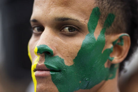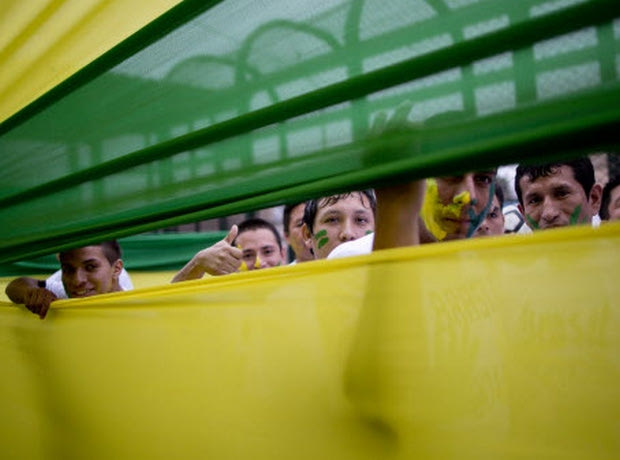 Inmates peer from a flag with Brazil's colors as they wait for the opening ceremony of the football championship for prisoners in Lima Peru, Monday, June 2, 2014. Peru's prison service organized a championship between inmates of various jails just ten days of the start of the World Cup in Brazil. (AP Photo/Rodrigo Abd)