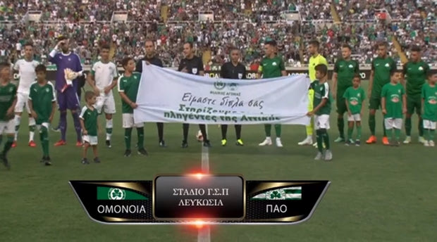 Μήνυμα στήριξης στους πληγέντες από τις πυρκαγιές στην Ανατολική Αττική έστειλε η Ομόνοια, πριν από την έναρξη του φιλικού αγώνα με τον Παναθηναϊκό στο “ΓΣΠ” της Λευκωσίας.
