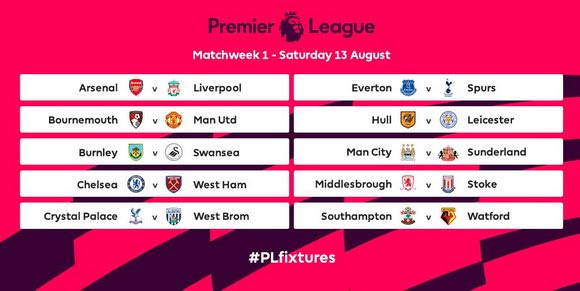 Η Premier League ανακοίνωσε επίσημα την Τετάρτη (15/6) το πρόγραμμα για τη σεζόν 2016-17 στην κορυφαία κατηγορία του αγγλικού πρωταθλήματος, με την πρεμιέρα να περιλαμβάνει το σπουδαίο ματς στο Λονδίνο μεταξύ της Άρσεναλ και της Λίβερπουλ αλλά και την εκτός έδρας μάχη της πρωταθλήτριας Λέστερ με την νεοφώτιστη Χαλ.
