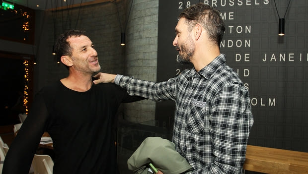 Ο Αντώνης Νικοπολίδης χαιρετά τον Γιούρκα Σεϊταρίδη (πίσω ο Βασίλης Τσιάρτας και δεξιά ο Μιχάλης Καψής)