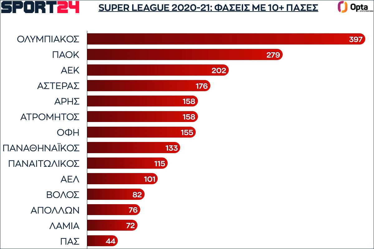 Μακράν πρώτος ο Ολυμπιακός με 397 επιθέσεις με 10+ πάσες στην περσινή κανονική διάρκεια. Δεύτερος, με σημαντική απόσταση ο ΠΑΟΚ στις 279 φάσεις με πάνω από δέκα πάσες και 3η η ΑΕΚ με 202.
