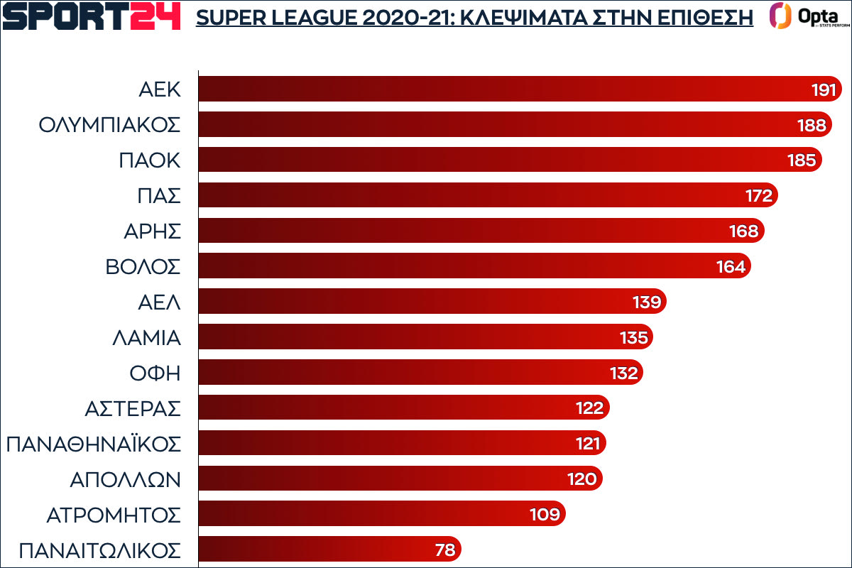 Τι έκανε πέρυσι ο ΠΑΣ; Πίεζε και έκλεβε. Δείτε στο γράφημα με τα στοιχεία της Opta/Stats Perform τις επιδόσεις των ομάδων στην περσινή κανονική διάρκεια της Super League στα high turnovers.