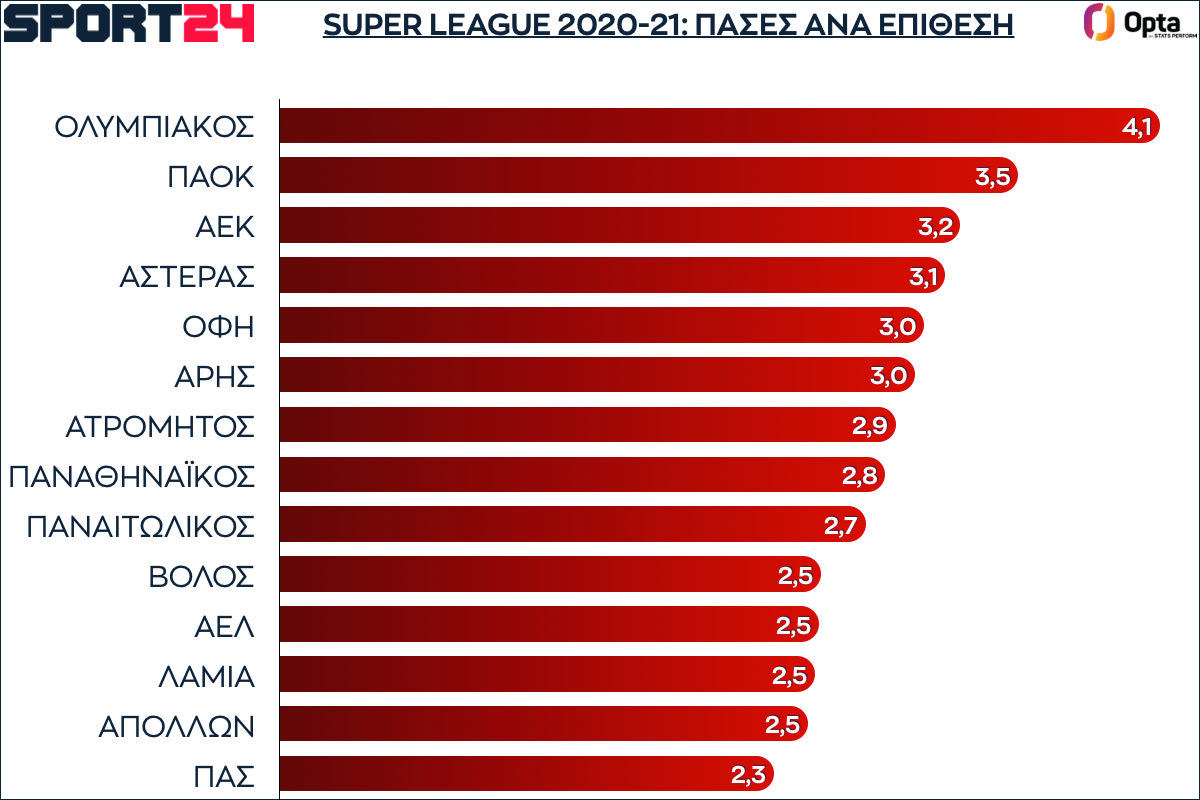 Κι αν δεν σας αρκούν οι επιθέσεις με 10+ πάσες, δείτε και τον μέσο όρο των ομάδων. Αυτές είναι οι πάσες των ομάδων ανά επίθεση στην περσινή Super League.