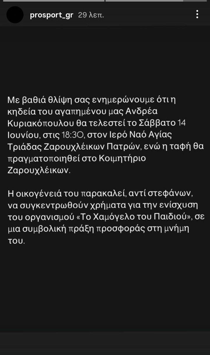 Η εταιρεία Prosport έκανε γνωστό ότι η κηδεία του εκπροσώπου της, Ανδρέα Κυριακόπουλου θα γίνει το Σάββατο στην Πάτρα.