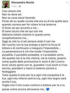 Άλε, αυτή δεν είναι δική μου νίκη, αλλά δική μας, όπως εκείνος ο προβιβασμός στη Serie A με τη Λιβόρνο. Ήθελα να χαρώ μαζί σου, να δω τα μάτια σου και το χαμόγελό σου, να σε πάρω στα χέρια και μαζί να τρέξουμε και να πανηγυρίσουμε. Αυτό είναι μόνο για σένα και κάθε νίκη είναι δική σου, κάθε όνειρό μου είναι θα είναι επίσης δικό σου. Θέλω η καρδιά μου να συνεχίσει να χτυπάει για σένα και εσύ να μπορείς να ζεις μέσα από μένα.