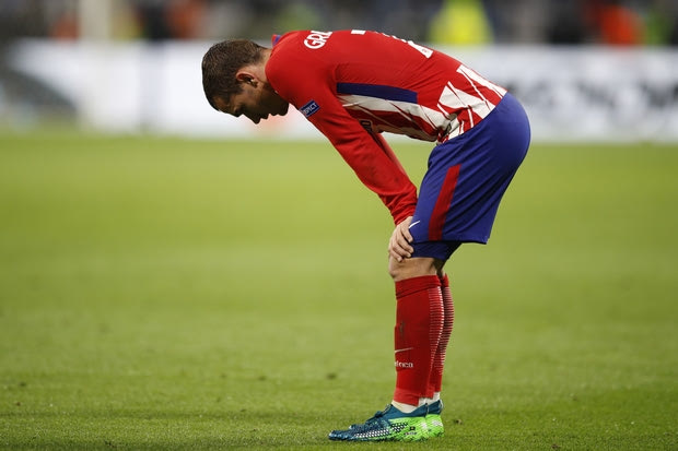 Atletico's Antoine Griezmann pauses during the Europa League Final soccer match between Marseille and Atletico Madrid at the Stade de Lyon in Decines, outside Lyon, France, Wednesday, May 16, 2018. (AP Photo/Francois Mori)