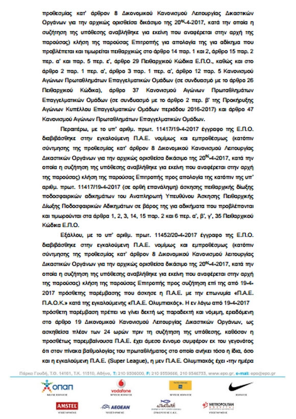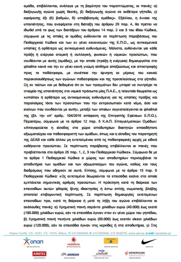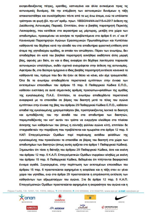 Η ΕΠΟ έδωσε στη δημοσιότητα το σκεπτικό της απόφασης, βάσει του οποίου τιμωρήθηκε ο Ολυμπιακός με πρόστιμο και τιμωρία τεσσάρων αγωνιστικών για όσα έγιναν στον πρώτο ημιτελικό με την ΑΕΚ.