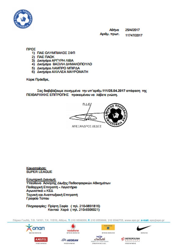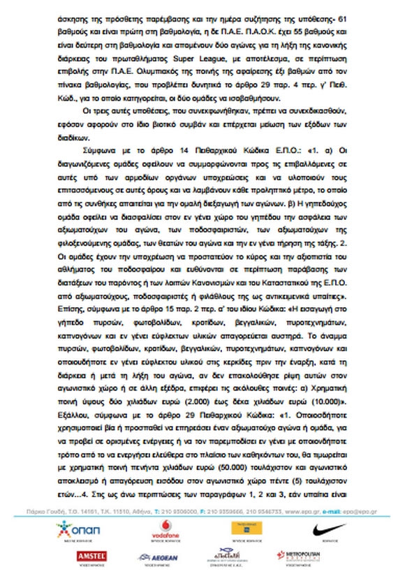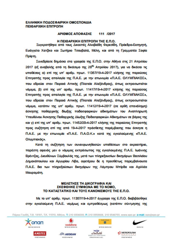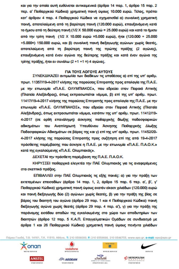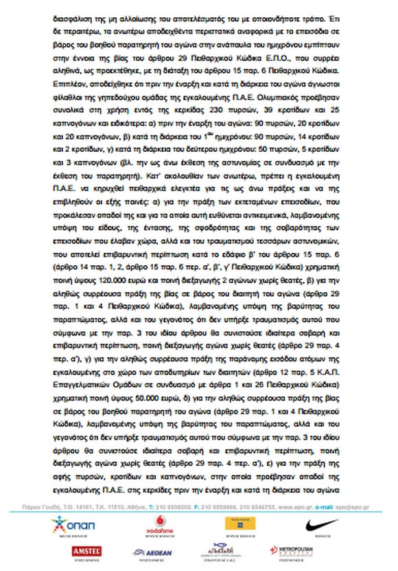 Το σκεπτικό της απόφασης για την τιμωρία του Ολυμπιακού