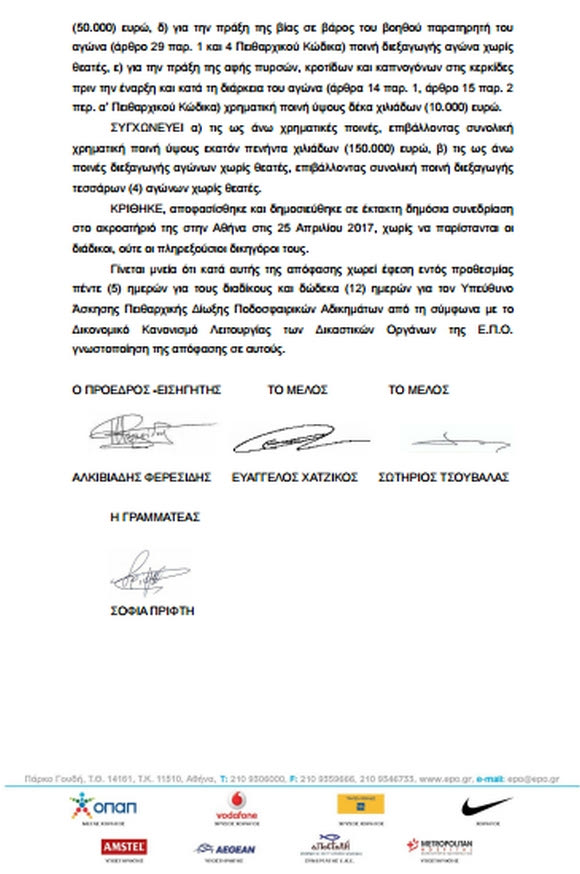 Τέλος, απ’ την στιγμή που υπήρξε λεκτικός προπηλακισμός προς τον διαιτητή κι όχι βιαιοπραγία, έγινε χρήση του Άρθρου 29 του Πειθαρχικού Κώδικα της ΕΠΟ, στο οποίο η χαμηλότερη προβλεπόμενη ποινή είναι το κεκλεισμένων των θυρών.
