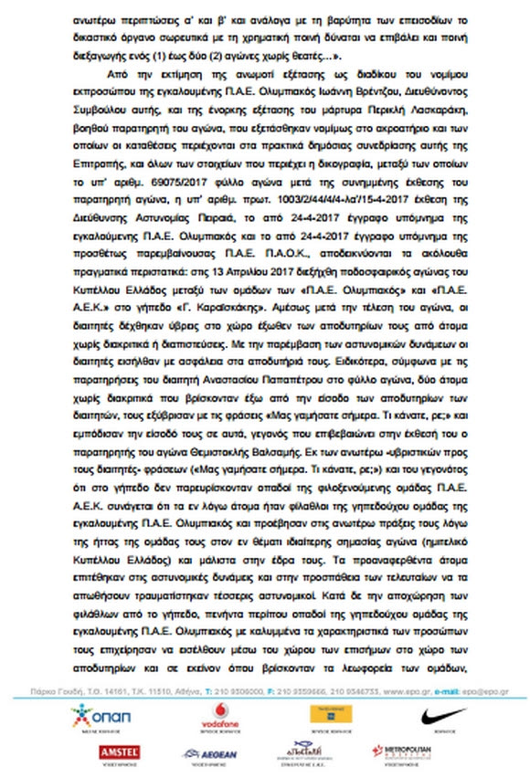Στο σκεπτικό εννέα σελίδων της απόφασης για την τιμωρία του Ολυμπιακού, η Πειθαρχική Επιτροπή εξηγεί αναλυτικά τους λόγους που αποφάσισε την τιμωρία των “ερυθρολεύκων”. Συγκεκριμένα, όπως αναφέρεται, αμέσως μετά την ολοκλήρωση του αγώνα οι διαιτητές δέχθηκαν ύβρεις έξω απ’ τα αποδυτήρια από άτομα, τα οποία δεν έφεραν διακριτικά ή διαπιστεύσεις.