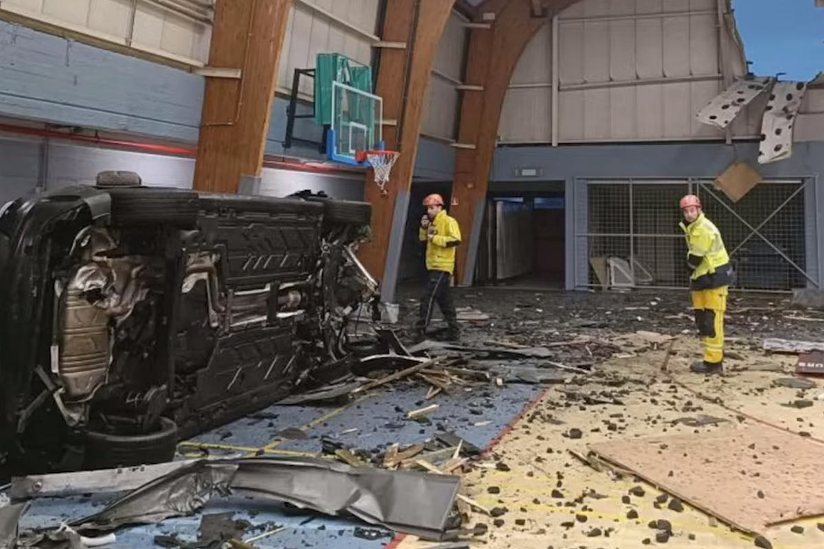 Το όχημα του 25χρονου που είχε αναπτύξει ταχύτητα πάνω από 200 χλμ/ώρα αφού προσέκρουσε σε κυκλικό κόμβο, προσγειώθηκε σε ένα κλειστό γήπεδο μπάσκετ, καταστρέφοντας τον τοίχο του κτιρίου, όπως φαίνεται στο σοκαριστικό στιγμιότυπο.