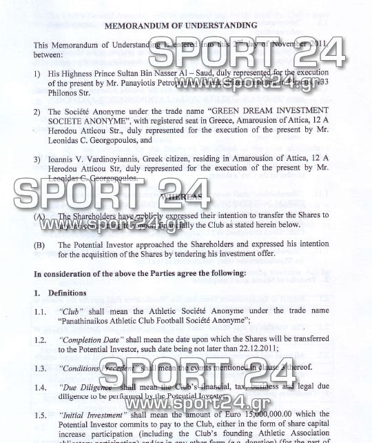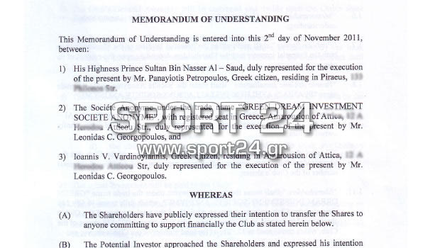 To Sport24.gr παρουσιάζει σε αποκλειστικότητα το "Memorandum of Understanding" μεταξύ των μετόχων και του Πρίγκιπα Αλ Σαούντ. Διαβάστε τις λεπτομέρειες, τους όρους και την ενδιαφέρον ρήτρα για την Παιανία που αφορά τον Βαρδινογιάννη.