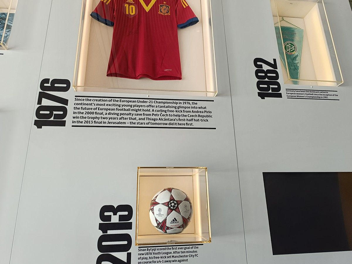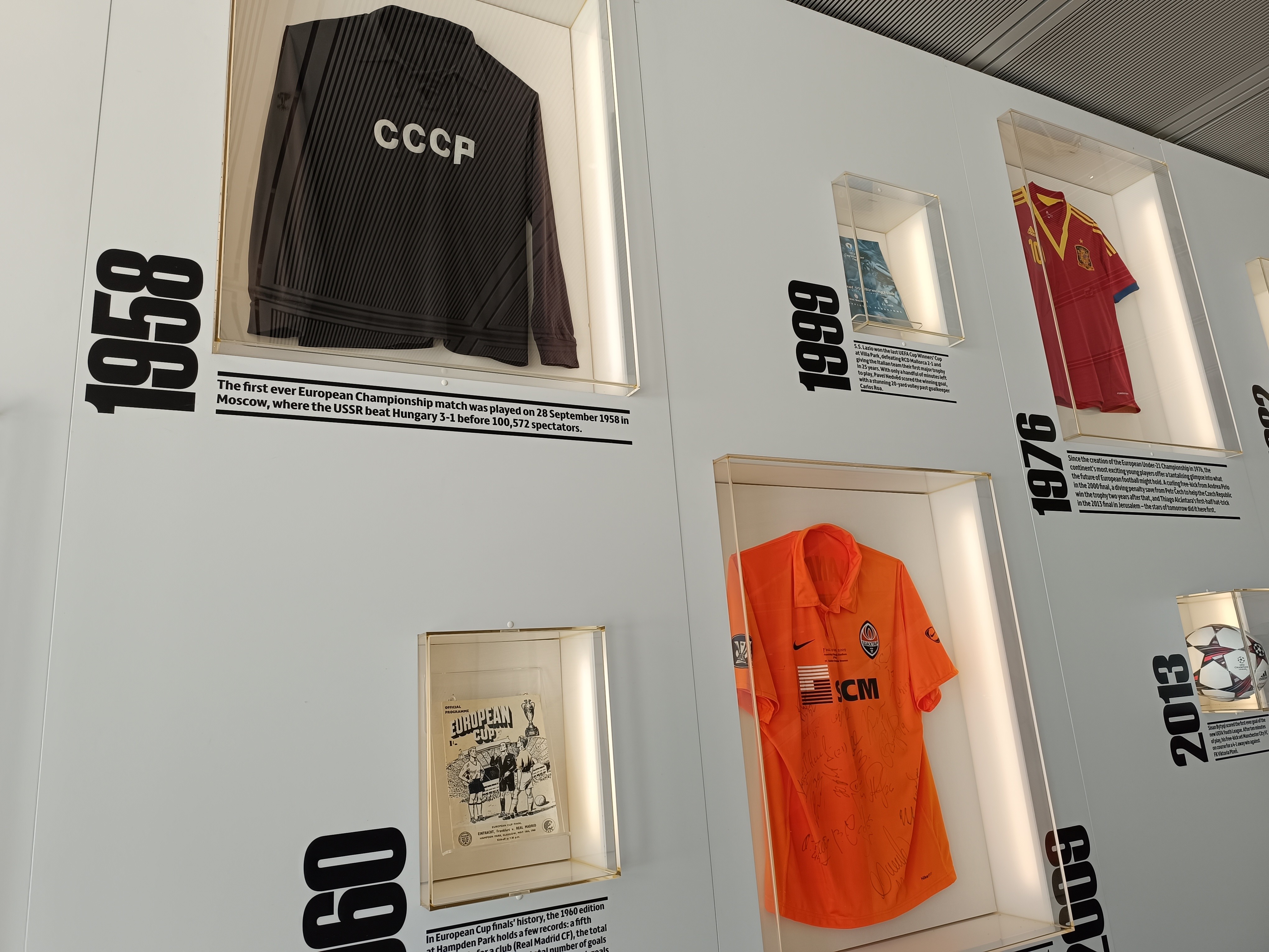 Η φανέλα της Σοβιετικής Ένωσης στο πρώτο παιχνίδι του ευρωπαϊκού πρωταθλήματος το 1958, προγράμματα αγώνων από ιστορικούς τελικούς, η εμφάνιση της Σαχτάρ το 2009 στο τελευταίο Κύπελλο UEFA και η μπάλα του πρώτου Youth League συνθέτουν ένα υπέροχο σκηνικό.