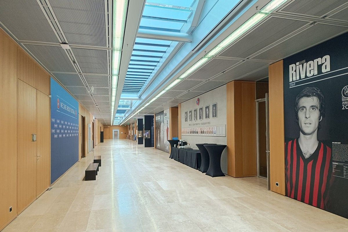 Η πρώτη εντύπωση που σου δίνουν τα κεντρικά της UEFA είναι ότι πρόκειται για ένα μεγάλο ποδοσφαιρικό… playground. Οι υπάλληλοι εργάζονται ανάμεσα σε μπάλες, διαπιστεύσεις, βραβεία και κάθε άλλος είδος που συνδέεται με το άθλημα.