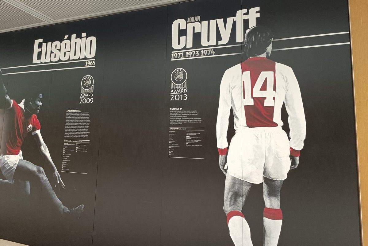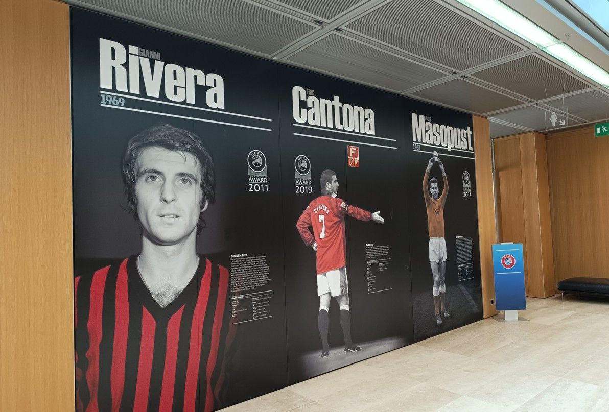 Η ξενάγηση στα γραφεία της UEFA συνεχίστηκε με ένα σύντομο “ταξίδι” στην ιστορία του ευρωπαϊκού ποδοσφαίρου. Ένας τοίχος με διάφορες “πρωτιές” των διοργανώσεων της Ομοσπονδίας.