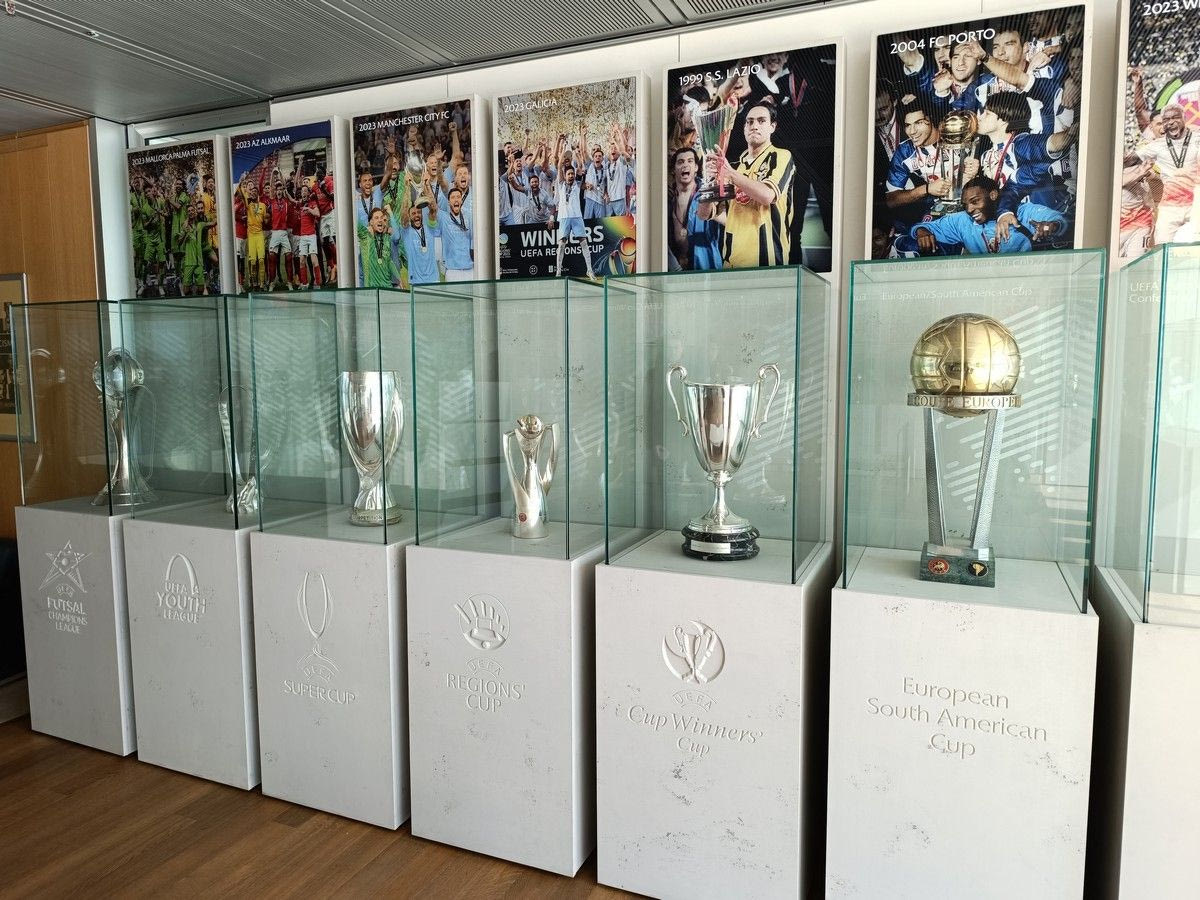 Η σειρά με τα τρόπαια συνεχίζεται και το μάτι πέφτει σε ιστορικές κούπες παλαιότερων διοργανώσεων, όπως είναι αυτή του Κυπέλλου Κυπελλούχων. Δυστυχώς από τις προθήκες έλειπαν οι κούπες του Champions League, του Europa League και του Conference League. Άλλωστε οι τελικοί πλησιάζουν.
