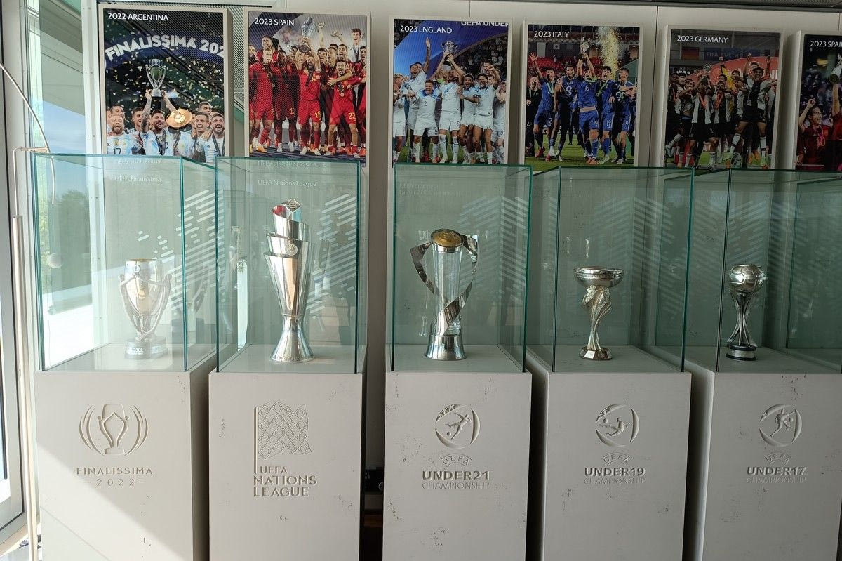 Από τα αριστερά προς τα δεξιά τα τρόπαια των: Finalissima, Nations League, Euro K21, Euro K19, Euro K17 SPORT24