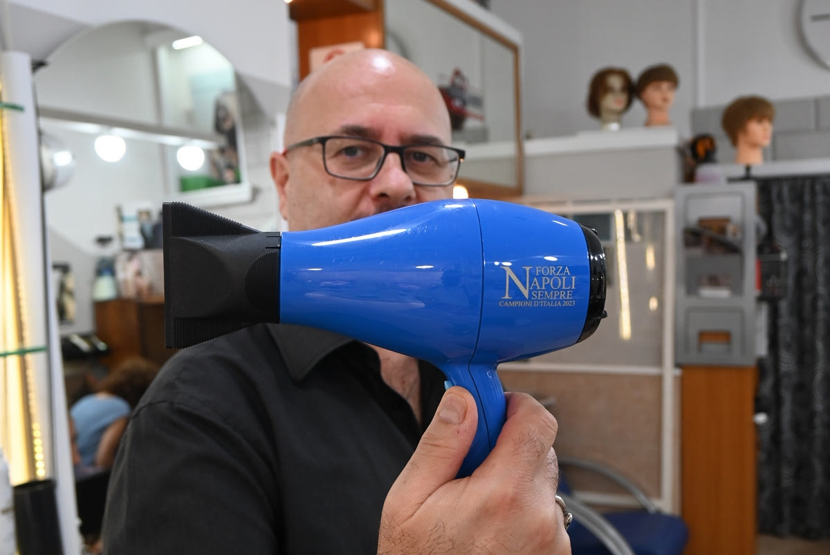 Το μάτι έπεσε πάνω σε ένα από αυτά. Πάνω από τον καθρέφτη υπήρχε μια μεγάλη αφίσα με το σήμα της ομάδας. Μόλις ο ιδιοκτήτης του κομμωτηρίου αντιλήφθηκε την ύπαρξή μας ενθουσιάστηκε και μας έδειξε το πιστολάκι που κρατούσε στα χέρια για να περιποιηθεί την πελάτισσά του. Δεν ήταν όποιο κι όποιο πιστολάκι. Ήταν ένα πιστολάκι, πάνω στο οποίο υπήρχε γραμμένο το σύνθημα Forza Napoli.