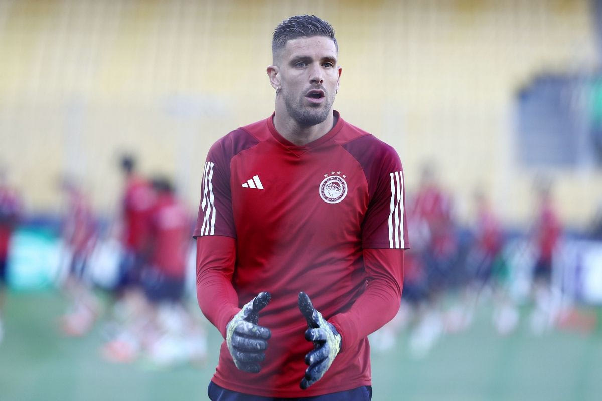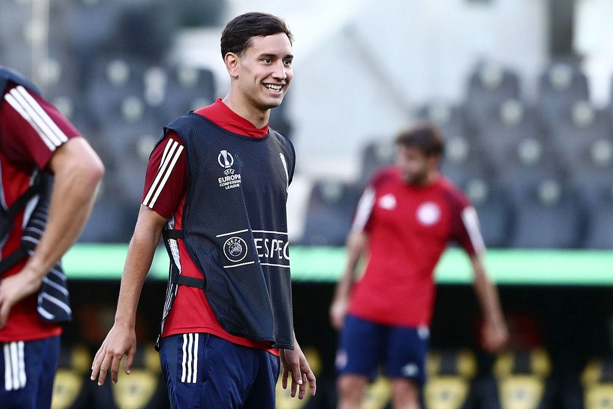 Ο Γιώργος Μασούρας στην προπόνηση του Ολυμπιακού στην OPAP Arena ενόψει του τελικού του Conference League