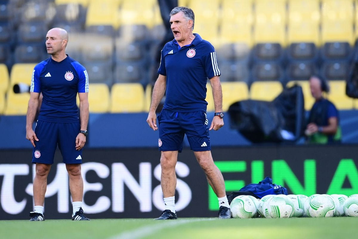 Ο Χοσέ Λουίς Μεντιλίμπαρ δίνει οδηγίες στους παίκτες του, στην προπόνηση του Ολυμπιακού στην OPAP Arena ενόψει του τελικού του Conference League