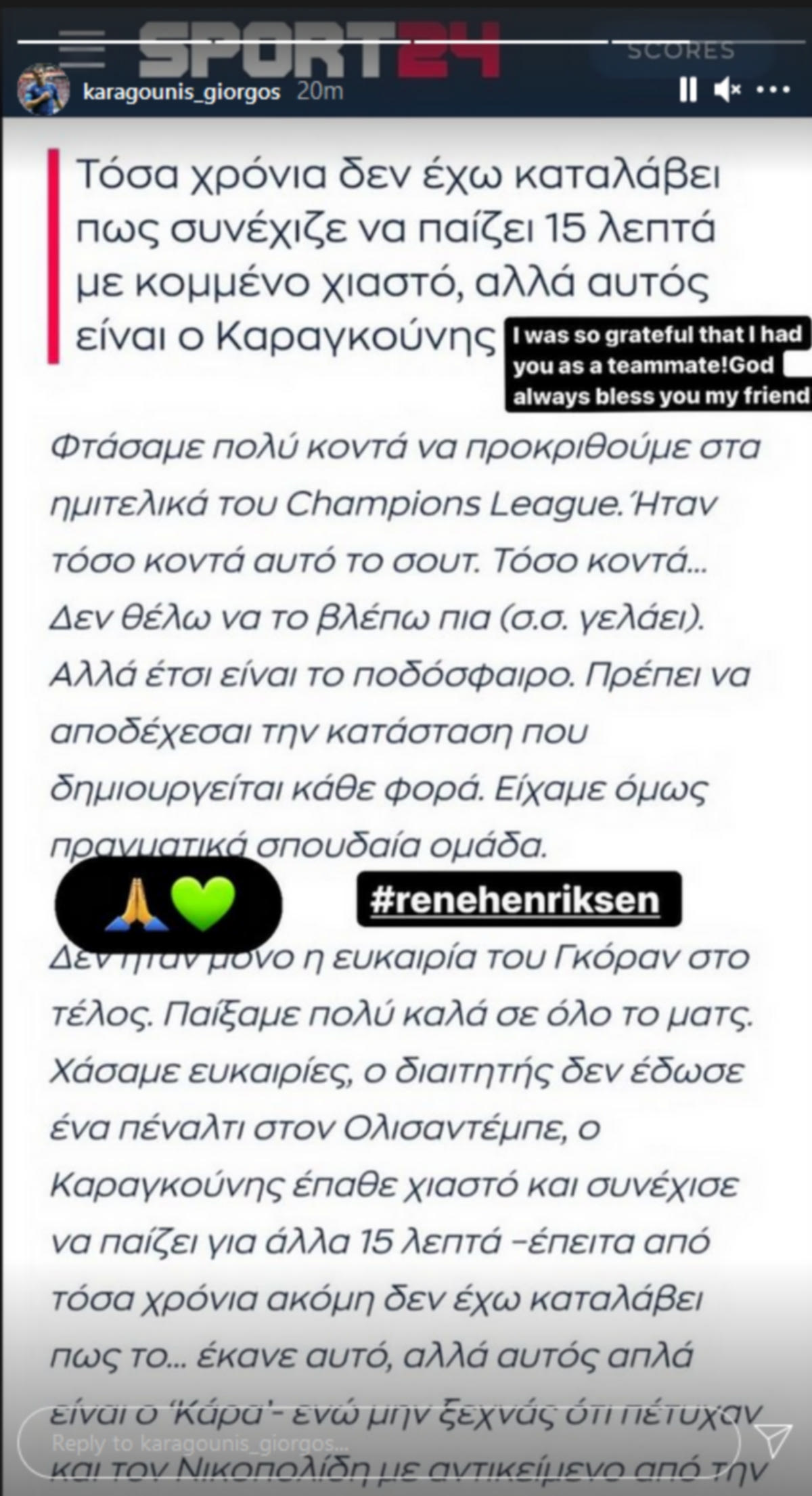 Η συνέντευξη του Ρενέ Χένρικσεν στο SPORT24 και η αναφορά του στον Γιώργο Καραγκούνη συγκίνησαν τον άλλοτε συμπαίκτη του στον Παναθηναϊκό, Γιώργο Καραγκούνη, ο οποίος αποθέωσε τον Δανό μέσω του επίσημου λογαριασμού του στο Instagram.