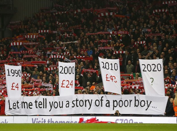 Σύμφωνα λοιπόν με το πανό, ενώ κάποιος μπορούσε με 4 μόνο λίρες να δει ένα ματς των “κόκκινων” το 1990, το 2000 το κόστος “εκτοξεύτηκε” στις 24 λίρες, το 2010 έγινε… 43 λίρες ενώ άγνωστο είναι ποιά θα είναι η τιμή το 2020!