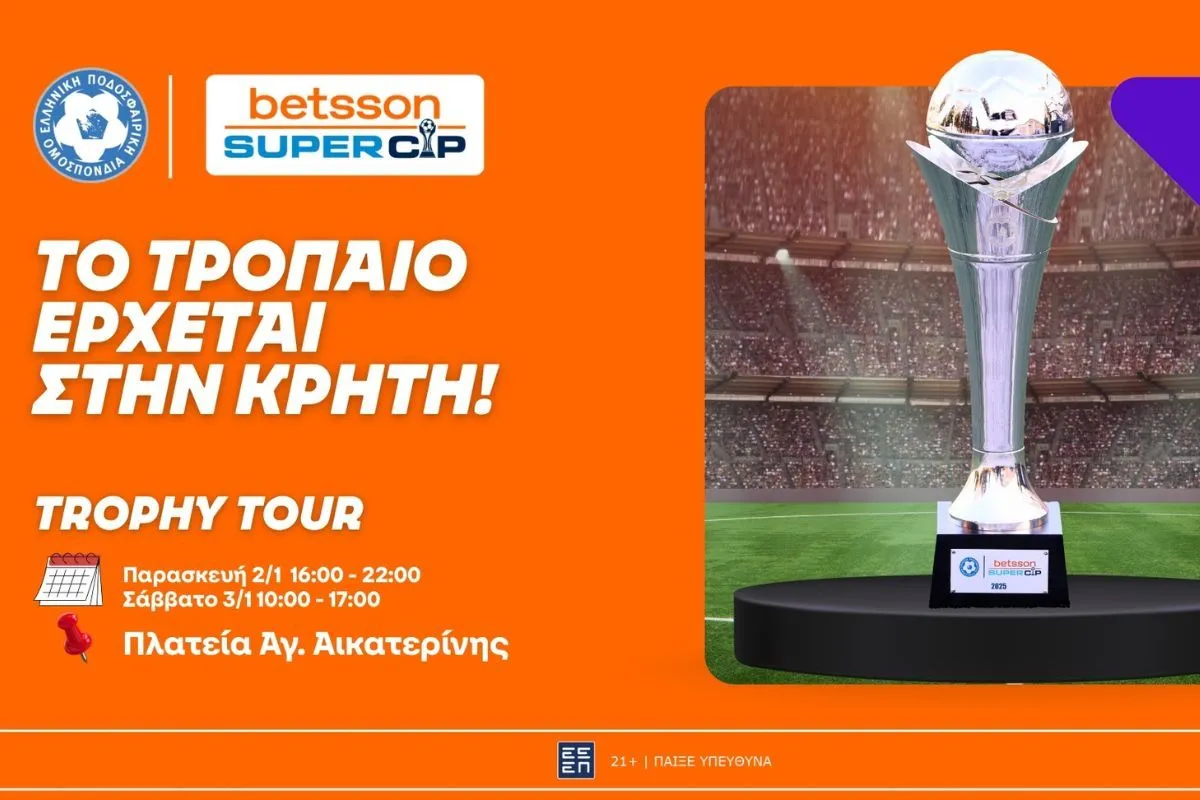 Μετά την πρώτη στάση του στον Πειραιά, το Trophy Tour του Betsson Super Cup συνεχίζει το ταξίδι του και κατεβαίνει στην Κρήτη, φέρνοντας τον παλμό της μεγάλης διοργάνωσης ακόμα πιο κοντά στον κόσμο του Ηρακλείου.