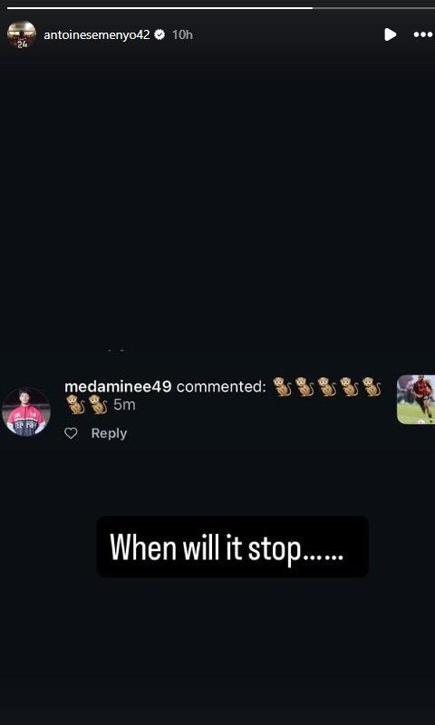 Μετά το ματς, ο Σεμένιο έσπασε τη σιωπή του στο Instagram ρωτώντας “πότε θα σταματήσει αυτό”, αφού ένας οπαδός ανέβασε κάτω από μία από τις φωτογραφίες του emoji με μαϊμού.