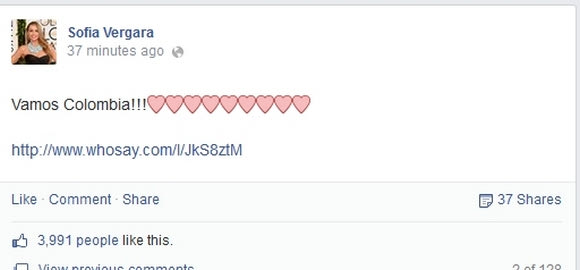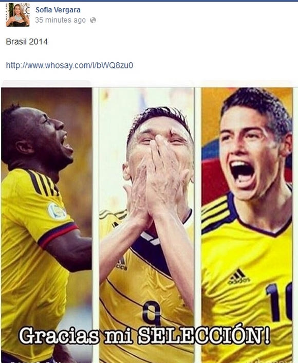 Η Σοφία Βεργκάρα πανηγύρισε για τα καλά τη νίκη της Κολομβίας στον αγώνα με την Ελλάδα και το έδειξε μέσω ποσταρισμάτων που έκανε στο Facebook.