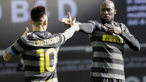 Inter Milan's Romelu Lukaku, right, celebrates with his teammate Lautaro Martinez after scoring during a Serie A soccer match between Inter Milan and Genoa at the San Siro stadium in Milan, Italy, Sunday, Feb. 28, 2021. (AP Photo/Luca Bruno) @ 2021 Luca Bruno/Associated Press