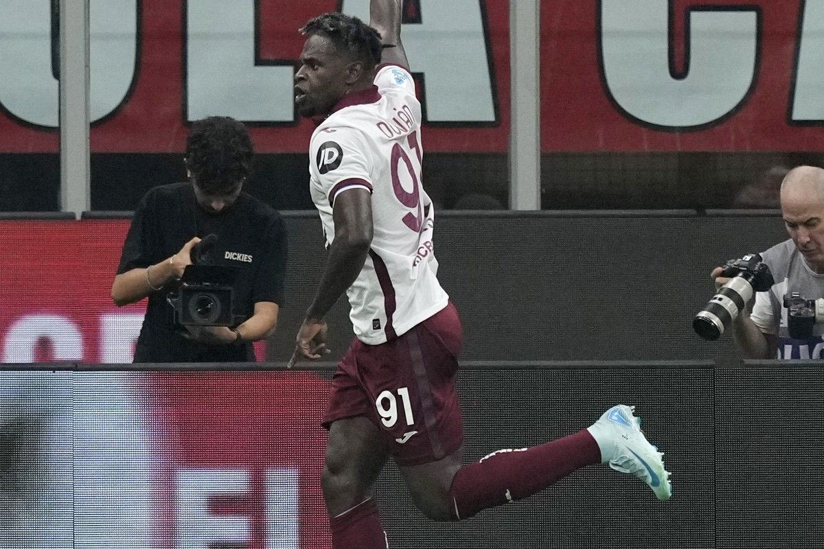 Torino's Duvan Zapata, right, celebrates after scoring his side's second goal during the Serie A soccer match between AC Milan and Torino at the San Siro stadium, in Milan, Italy, Saturday, Aug. 17, 2024. (AP Photo/Antonio Calanni) @2024 Antonio Calanni/AP IMAGES