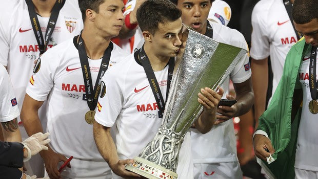 Sevilla's Sergio Reguilon kisses the trophy after winning the Europa League final soccer match between Sevilla and Inter Milan in Cologne, Germany, Friday, Aug. 21, 2020. (Lars Baron, Pool Photo via AP)