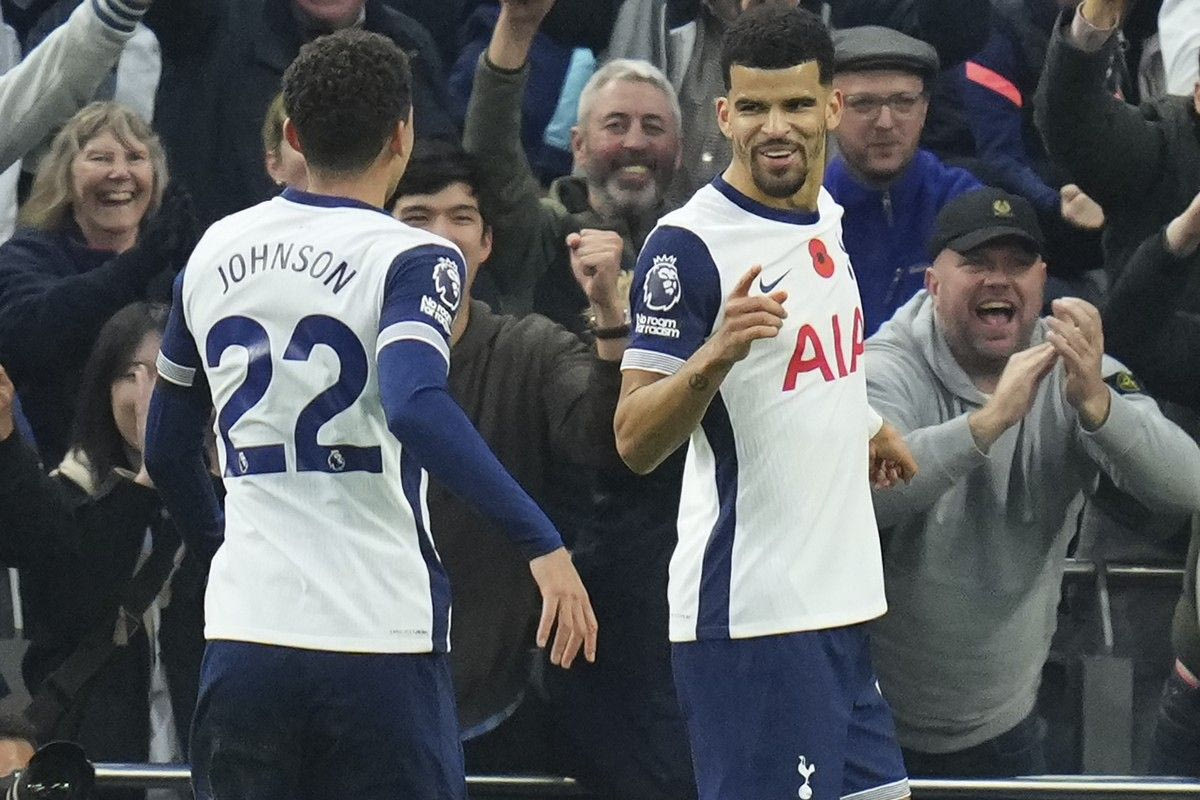 Tottenham's Dominic Solanke, right, celebrates with Brennan Johnson after scoring his side's second goal during the English Premier League soccer match between Tottenham Hotspur and Aston Villa at the Tottenham Hotspur Stadium in London, Sunday, Nov. 3, 2024. (AP Photo/Kirsty Wigglesworth)