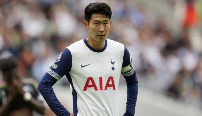 Tottenham's Son Heung-min stands on the pitch during the English Premier League soccer match between Tottenham Hotspur and Arsenal in London, Sunday, Sept. 15, 2024. (AP Photo/Kin Cheung)