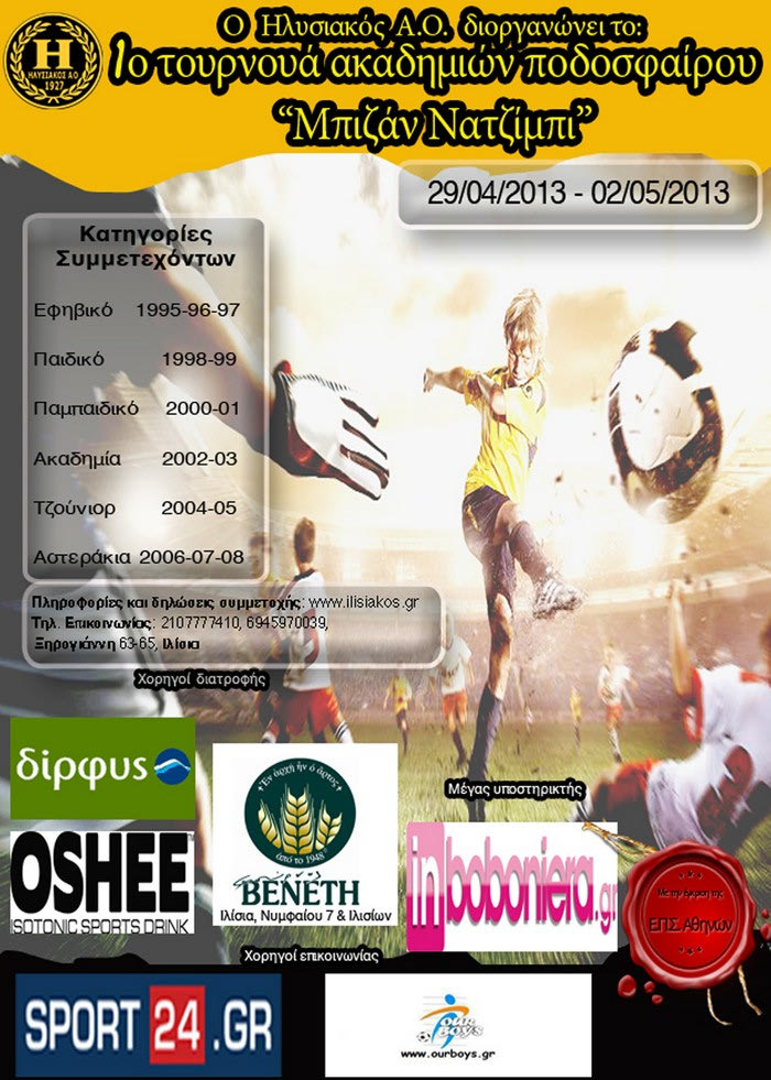 Στο πλαίσιο της συμπλήρωσης των 85 ετών από την ίδρυση του Ηλυσιακού, το ιστορικό σωματείο της Αθήνας διοργανώνει το 1ο τουρνουά Ακαδημιών Ποδοσφαίρου "Μπιζάν Νατζίμπι". Διαβάστε τις πληροφορίες
