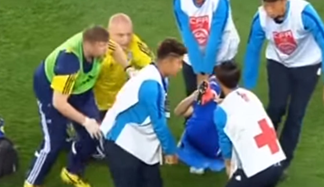 Πέφτοντας το πόδι του δεν πάτησε καλά, με αποτέλεσμα να γυρίσει. Αμέσως μεταφέρθηκε στο νοσοκομείο και λίγο αργότερα πέρασε την πόρτα του χειρουργείου. Για την ιστορία το Καζακστάν νίκησε με 1-0.